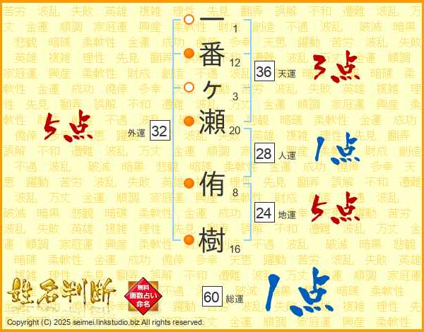 一番ヶ瀬侑樹さんの外運は32画の5点!