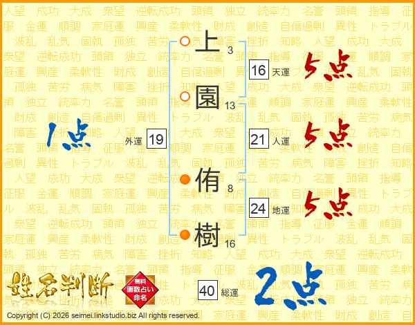 生活面を象徴する運勢です。外部から受ける影響力を表し、結婚運、家庭運や職場、環境への順応性を表します。総運から人運を引いた画数。姓や名が1文字の場合を除く。