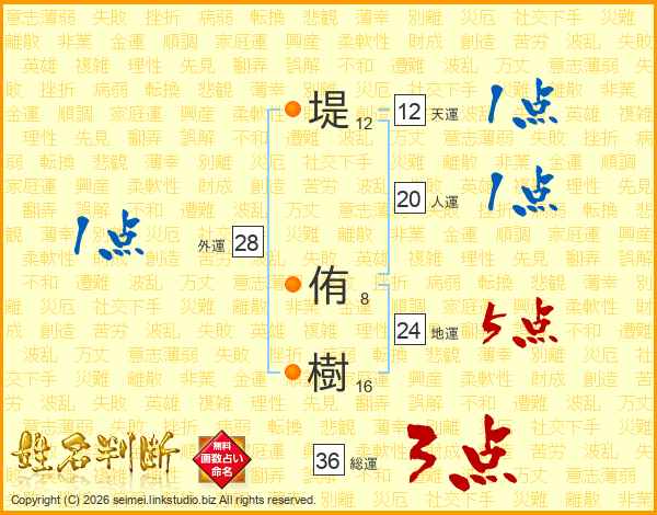 堤(12画) 侑(8画)樹(16画)