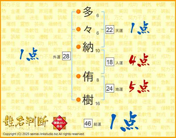多(6画)々(6画)納(10画) 侑(8画)樹(16画)