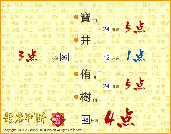 寶(20画)井(4画) 侑(8画)樹(16画)