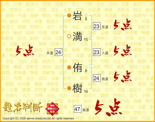 岩(8画)満(15画) 侑(8画)樹(16画)