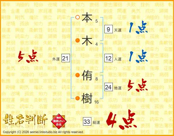 あなたの人生を表す1番重要な運勢です。生涯を通じて影響する総合運となり、主に50歳以降の晩年期に影響を及ぼします。苗字と名前の合計画数。