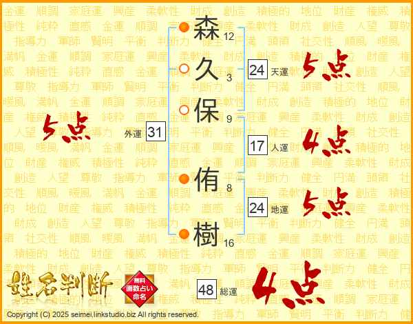 森(12画)久(3画)保(9画) 侑(8画)樹(16画)