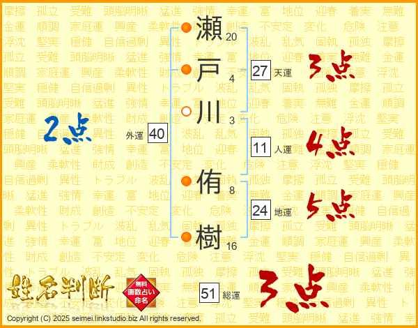 瀬(20画)戸(4画)川(3画) 侑(8画)樹(16画)