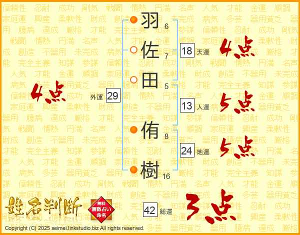 羽佐田侑樹さんの外運は29画の4点!
