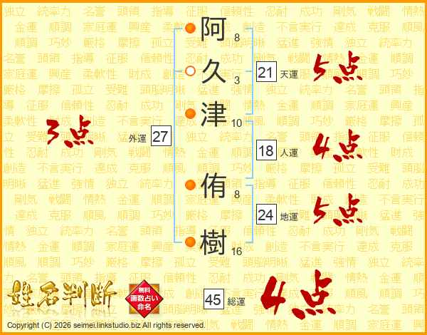 阿(8画)久(3画)津(10画) 侑(8画)樹(16画)