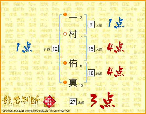 生活面を象徴する運勢です。外部から受ける影響力を表し、結婚運、家庭運や職場、環境への順応性を表します。総運から人運を引いた画数。姓や名が1文字の場合を除く。