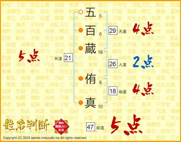 五(5画)百(6画)蔵(18画) 侑(8画)真(10画)
