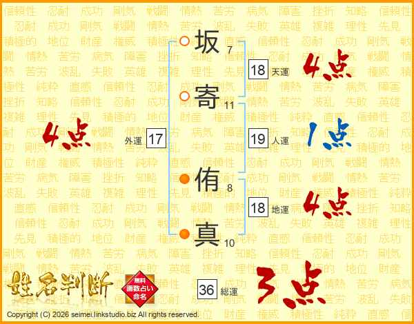 坂(7画)寄(11画) 侑(8画)真(10画)