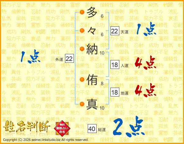 多(6画)々(6画)納(10画) 侑(8画)真(10画)