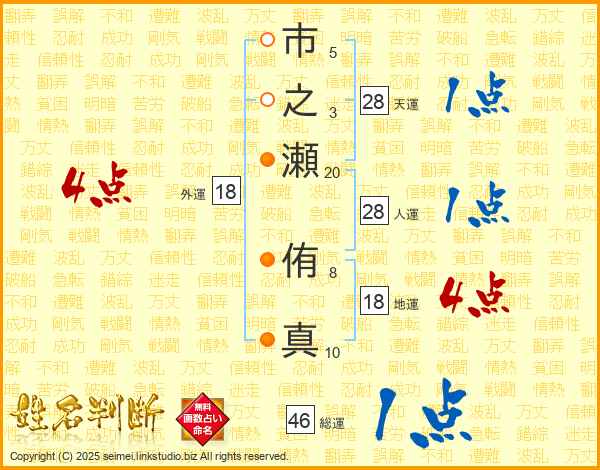 市(5画)之(3画)瀬(20画) 侑(8画)真(10画)