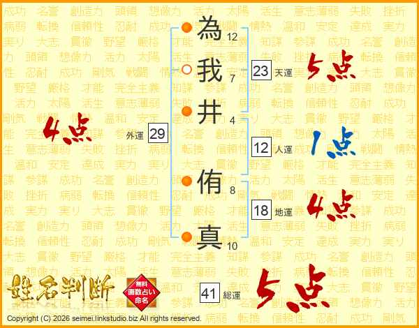 為(12画)我(7画)井(4画) 侑(8画)真(10画)