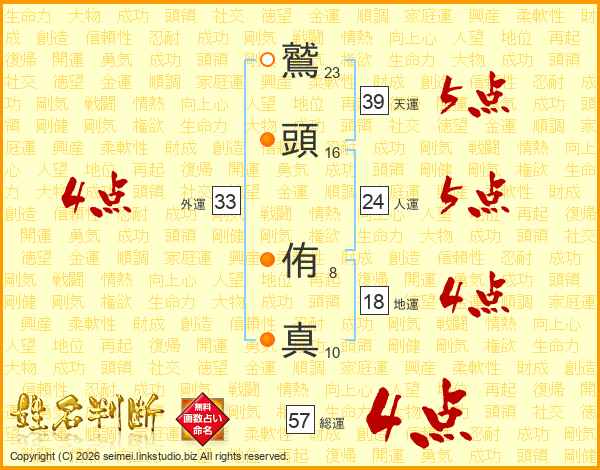 鷲頭侑真さんの総運は57画の4点!