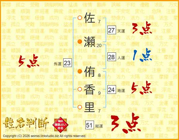 佐(7画)瀬(20画) 侑(8画)香(9画)里(7画)