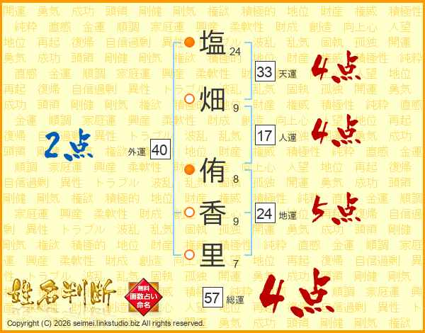 塩(24画)畑(9画) 侑(8画)香(9画)里(7画)
