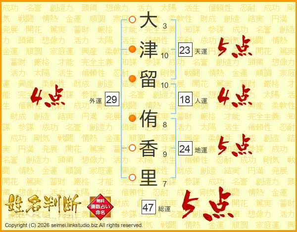 大(3画)津(10画)留(10画) 侑(8画)香(9画)里(7画)