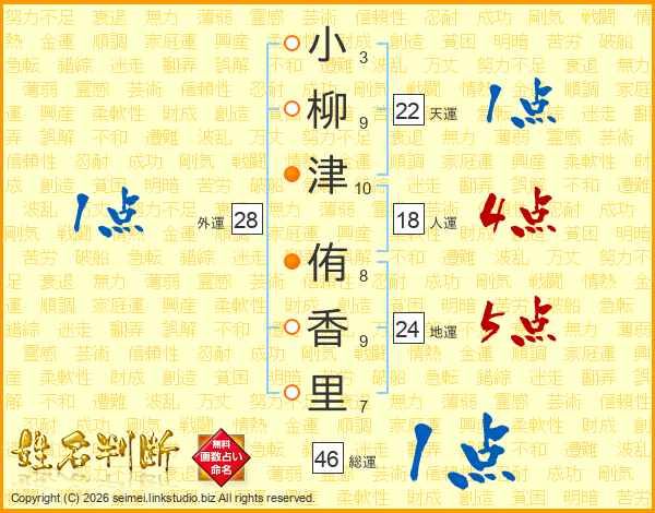 小(3画)柳(9画)津(10画) 侑(8画)香(9画)里(7画)