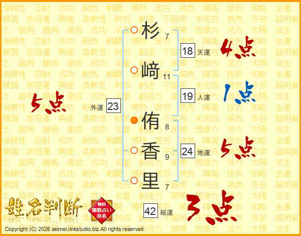 杉(7画)﨑(11画) 侑(8画)香(9画)里(7画)