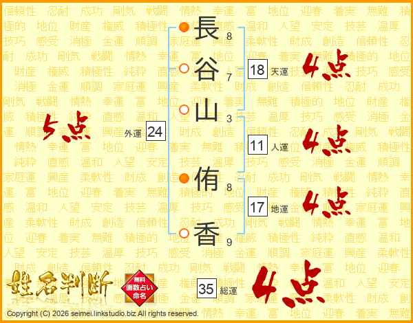 長(8画)谷(7画)山(3画) 侑(8画)香(9画)
