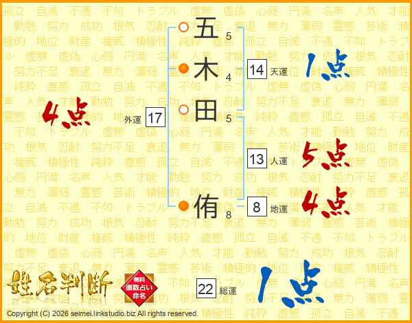 生活面を象徴する運勢です。外部から受ける影響力を表し、結婚運、家庭運や職場、環境への順応性を表します。総運から人運を引いた画数。姓や名が1文字の場合を除く。