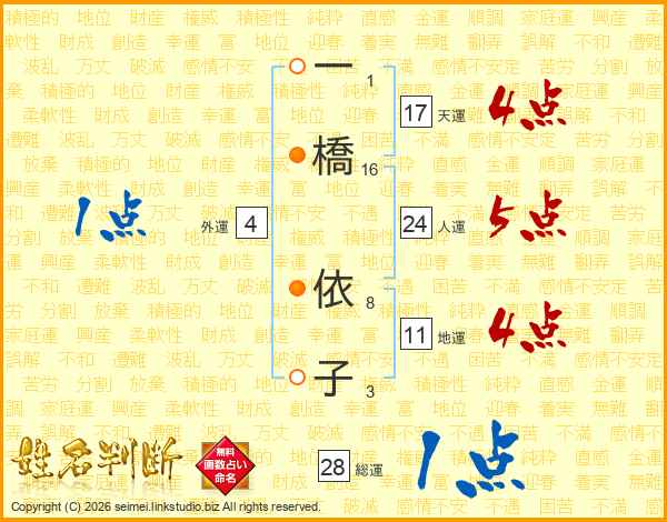 生活面を象徴する運勢です。外部から受ける影響力を表し、結婚運、家庭運や職場、環境への順応性を表します。総運から人運を引いた画数。姓や名が1文字の場合を除く。