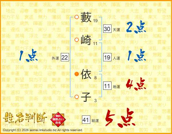 藪(19画)崎(11画) 依(8画)子(3画)