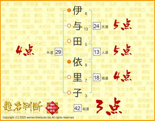 伊(6画)与(13画)田(5画) 依(8画)里(7画)子(3画)