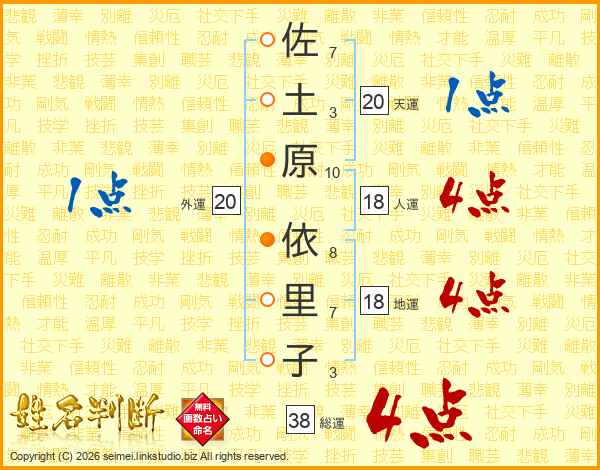 佐(7画)土(3画)原(10画) 依(8画)里(7画)子(3画)