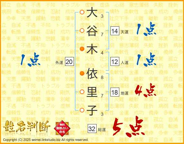 大(3画)谷(7画)木(4画) 依(8画)里(7画)子(3画)