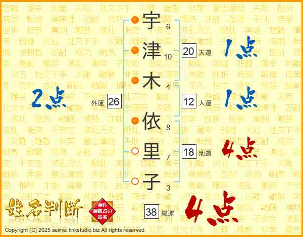 宇(6画)津(10画)木(4画) 依(8画)里(7画)子(3画)