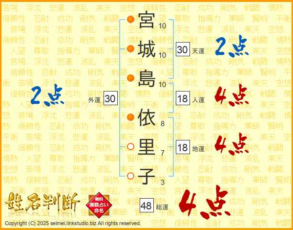 宮(10画)城(10画)島(10画) 依(8画)里(7画)子(3画)