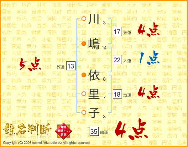 川(3画)嶋(14画) 依(8画)里(7画)子(3画)