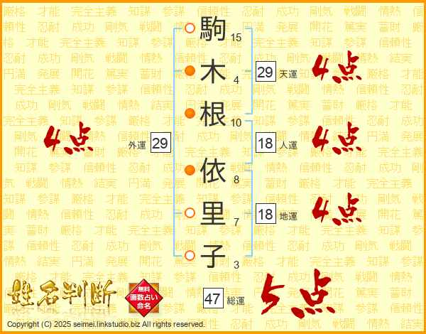 駒(15画)木(4画)根(10画) 依(8画)里(7画)子(3画)