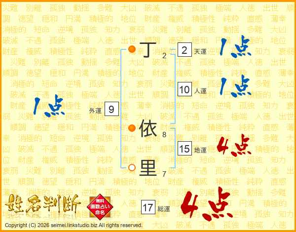 生活面を象徴する運勢です。外部から受ける影響力を表し、結婚運、家庭運や職場、環境への順応性を表します。総運から人運を引いた画数。姓や名が1文字の場合を除く。