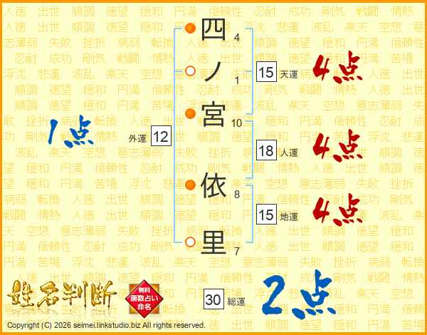 四(4画)ノ(1画)宮(10画) 依(8画)里(7画)