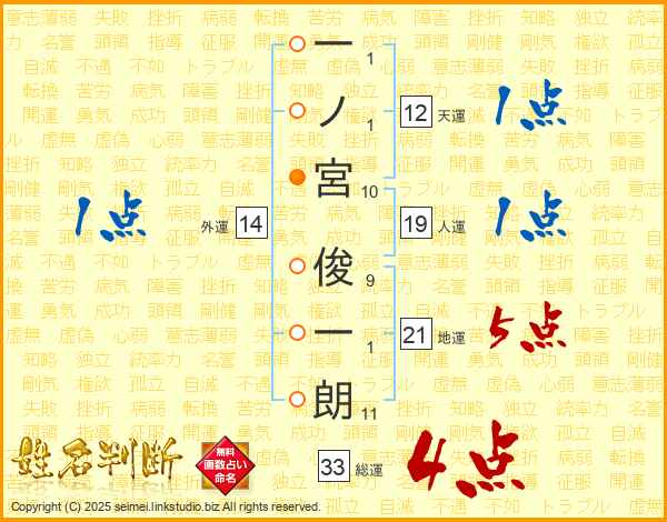 一(1画)ノ(1画)宮(10画) 俊(9画)一(1画)朗(11画)