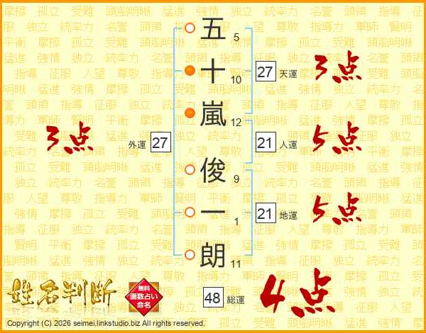 五(5画)十(10画)嵐(12画) 俊(9画)一(1画)朗(11画)