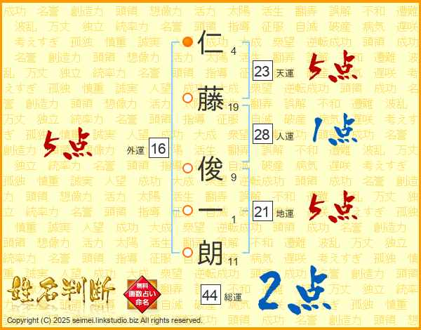 仁(4画)藤(19画) 俊(9画)一(1画)朗(11画)