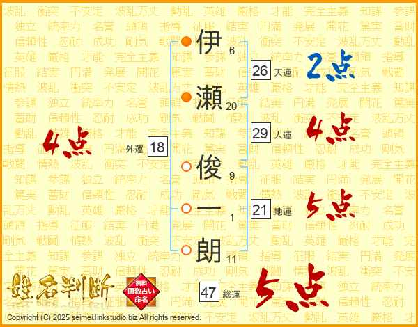 伊(6画)瀬(20画) 俊(9画)一(1画)朗(11画)