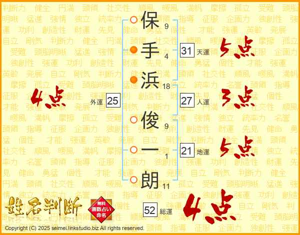 保手浜俊一朗さんの総運は52画の4点!