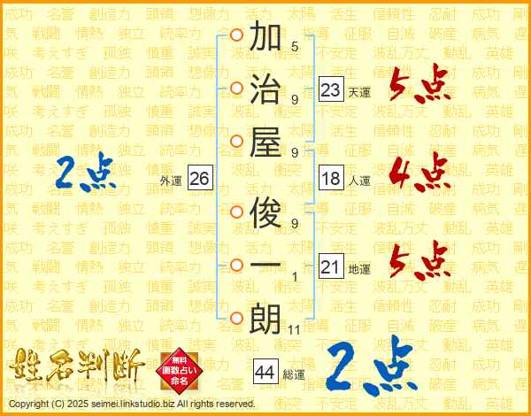 加(5画)治(9画)屋(9画) 俊(9画)一(1画)朗(11画)