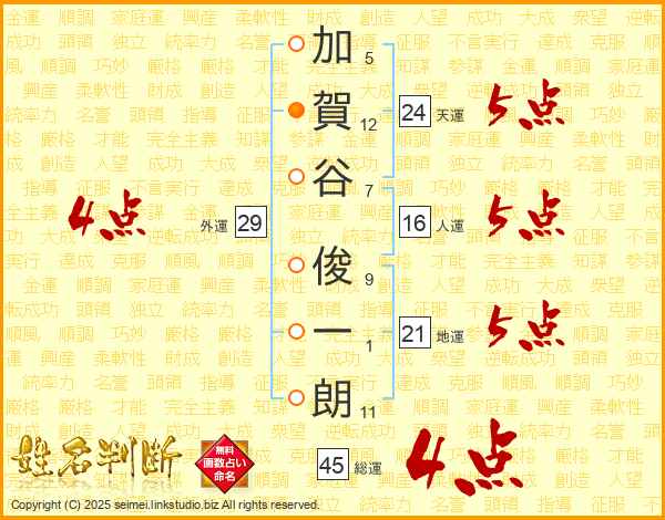 加(5画)賀(12画)谷(7画) 俊(9画)一(1画)朗(11画)