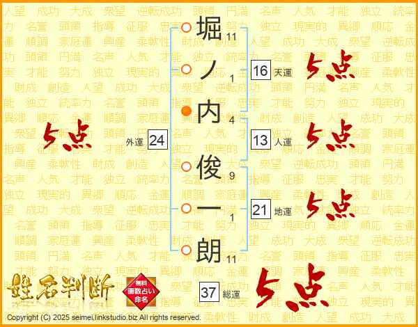 堀(11画)ノ(1画)内(4画) 俊(9画)一(1画)朗(11画)