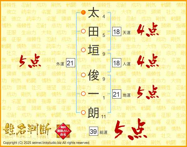 太(4画)田(5画)垣(9画) 俊(9画)一(1画)朗(11画)