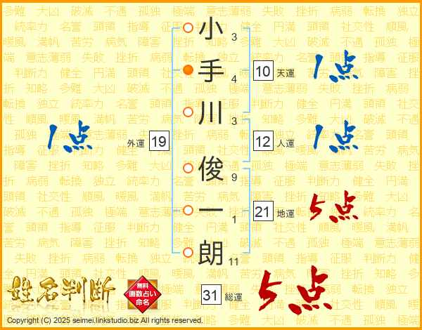 小(3画)手(4画)川(3画) 俊(9画)一(1画)朗(11画)