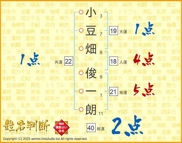 小(3画)豆(7画)畑(9画) 俊(9画)一(1画)朗(11画)