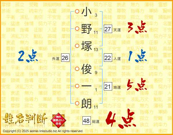 小(3画)野(11画)塚(13画) 俊(9画)一(1画)朗(11画)