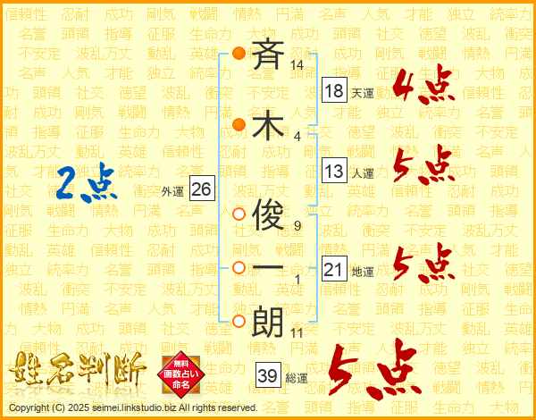 斉(14画)木(4画) 俊(9画)一(1画)朗(11画)