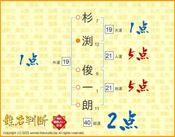杉(7画)渕(12画) 俊(9画)一(1画)朗(11画)